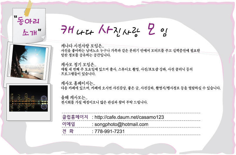 캐나다 사진사랑 모임은 사진을 좋아하는 남녀노소 누구나 가족과 같은 분위기 안에서 모티브를 주고 실력증진에 필요한 알찬 정보를 공유하는 공간입니다. &...